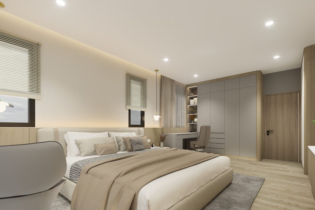 ออกแบบห้องนอนของคุณลูกค้าให้เรียบหรู สงบและอบอุ่น เน้นการวางผังที่ใช้งานง่าย แสงธรรมชาติ และโทนวัสดุพรีเมียม เพื่อให้พักผ่อนได้จริงทุกวันด้วยการจัดสรรสัดส่วนพื้นที่ให้ครบทั้งส่วนพักผ่อนและพื้นที่จัดเก็บ โดยการเพิ่มฟังก์ชันโซนแต่งตัวที่เป็นระเบียบ เหมาะกับการใช้งานจริงและดูหรูหรา